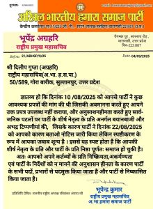 दिलीप अग्रहरि सुल्तानपुर को अखिल भारतीय हमारा समाज पार्टी से किया गया निष्कासित